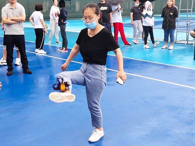 這是為女生們準(zhǔn)備的個(gè)人賽,同理,男生也可以挑戰(zhàn)。參加者每人一次機(jī)會(huì),踢毽子在不間斷、不落地的前提下,個(gè)數(shù)*多者勝利。并且冠*可以直接去選一個(gè)獎(jiǎng)品拿走。