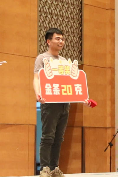 隨著三等獎的抽出,晚會氣氛達到一個小高潮。幸運兒們滿心歡喜地領取了獎品5克金條。